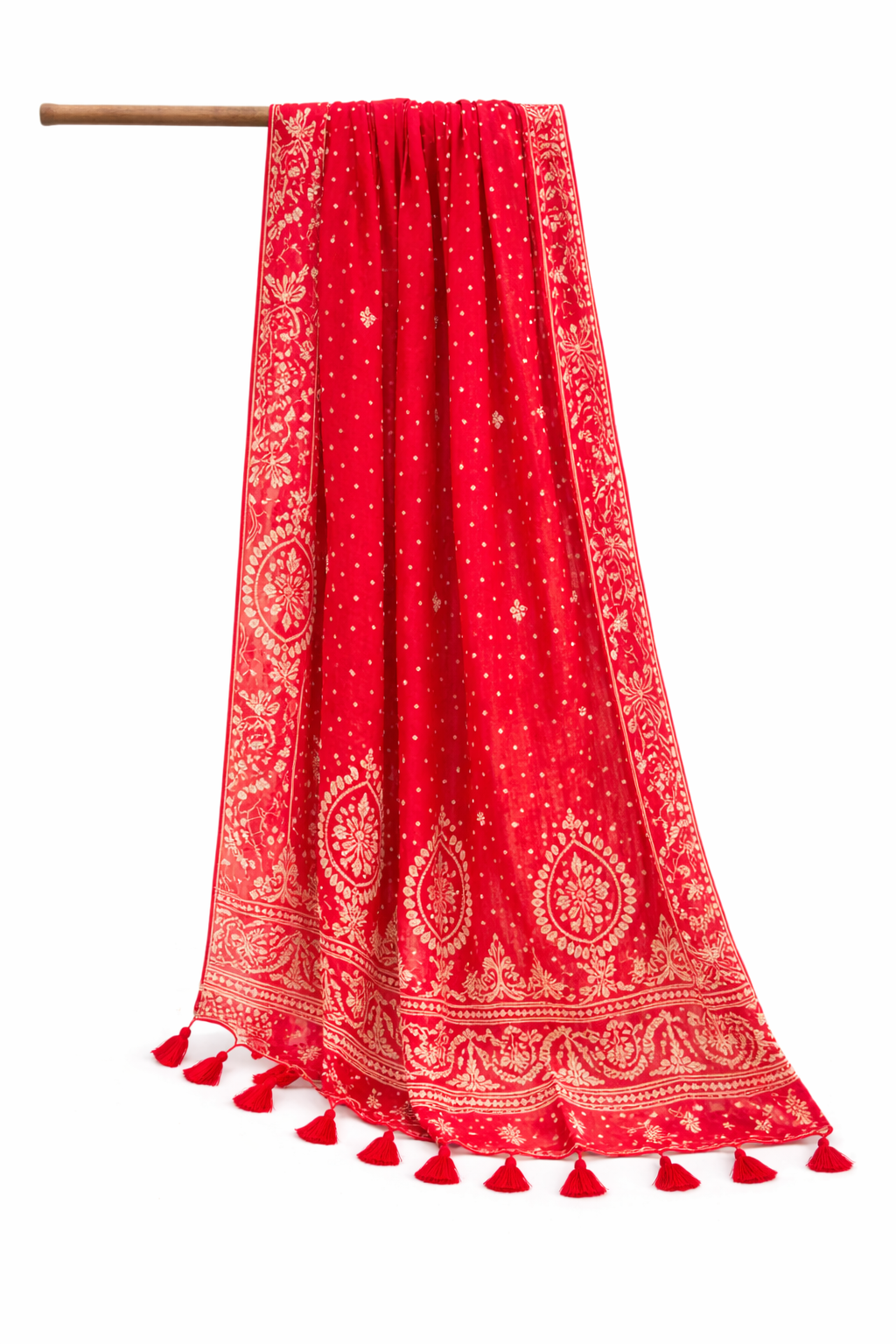 Elegant red dupatta featuring traditional bandhani-inspired prints, detailed border design, and tassel finish. Lightweight and perfect for festive and daily wear styling.